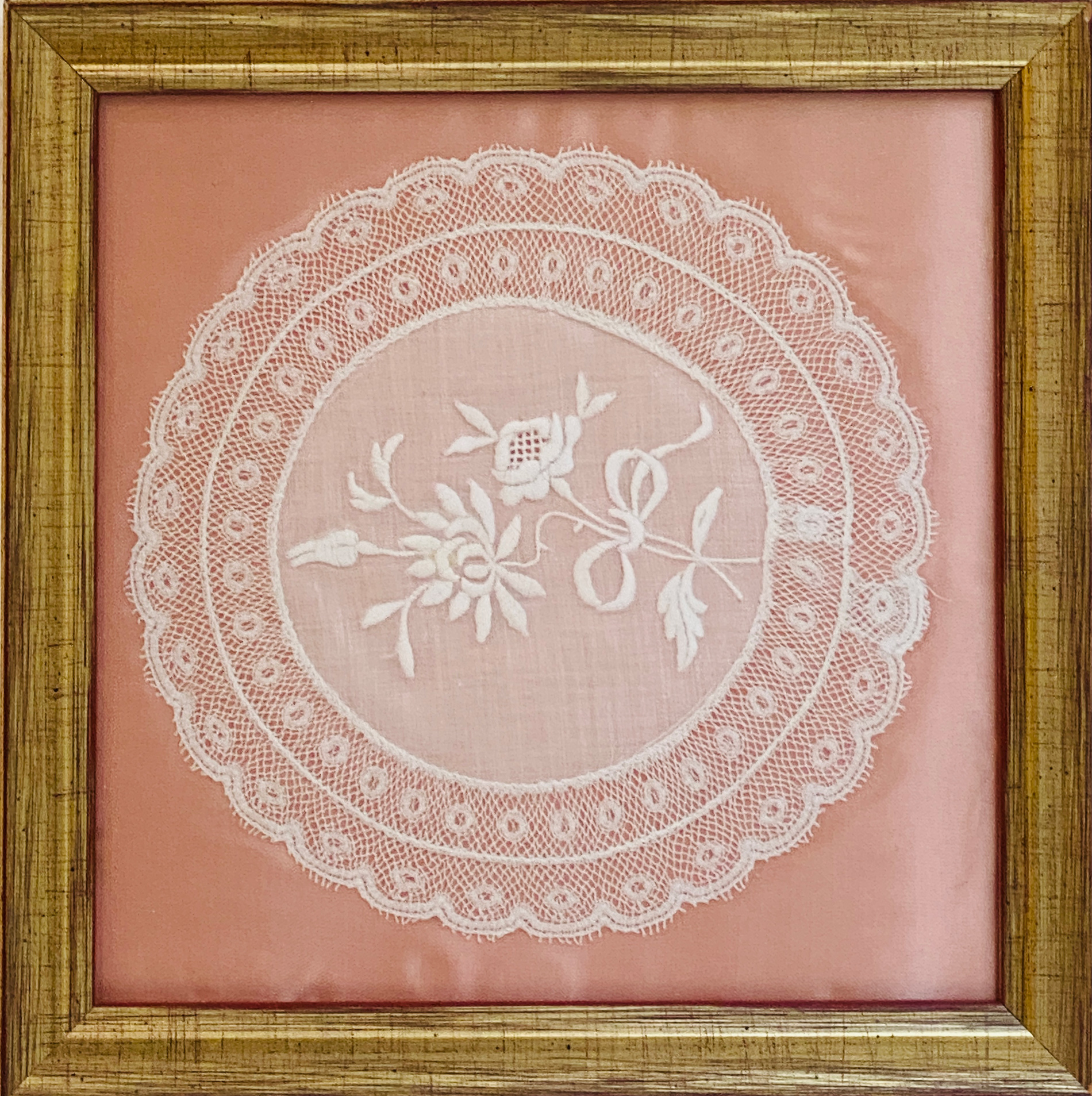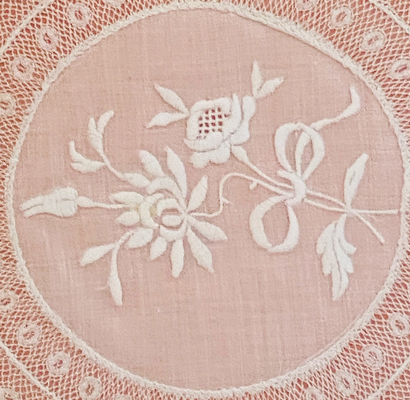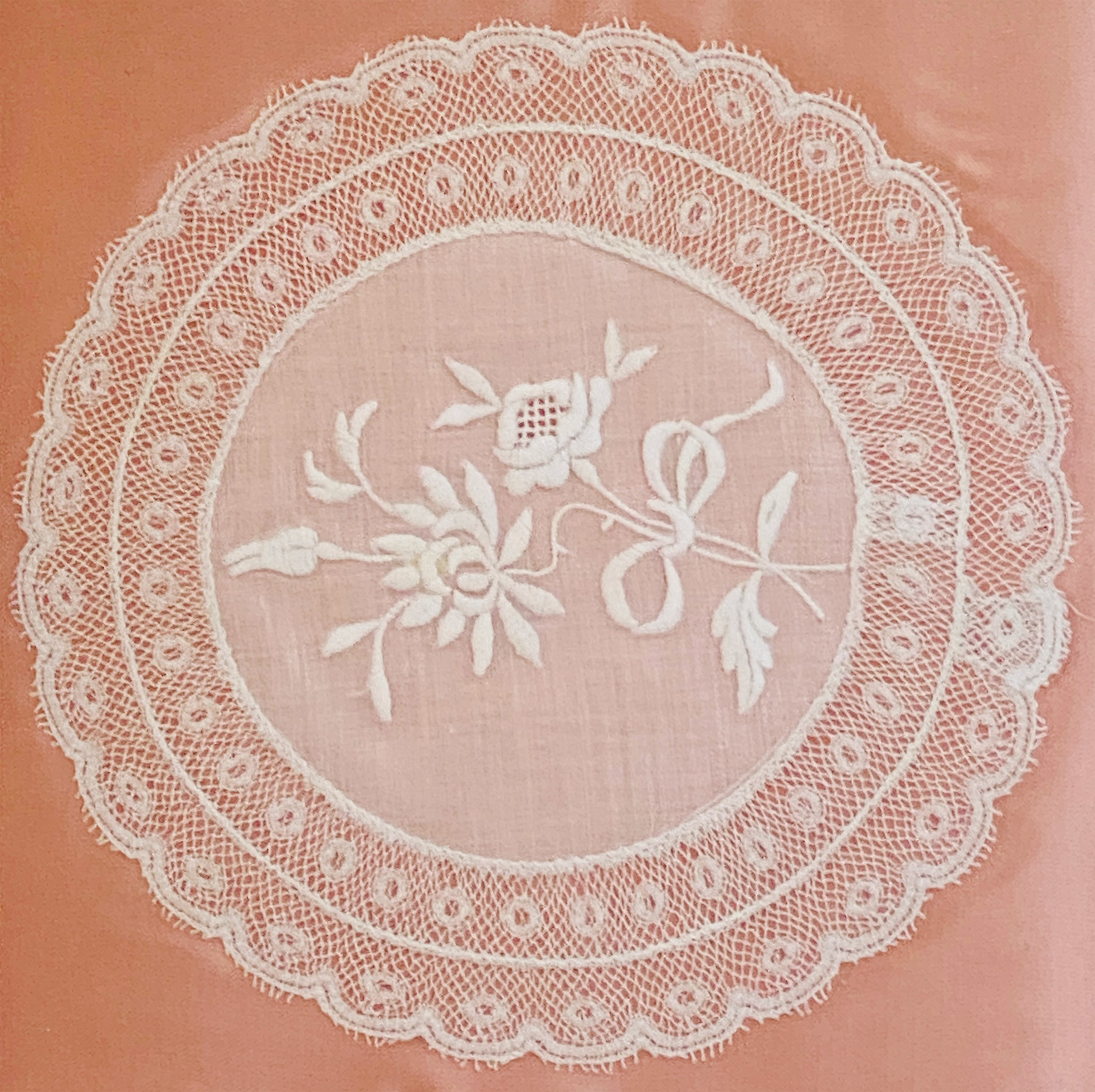 Caprichoso tapete bordado coronado por puntilla de bolillo